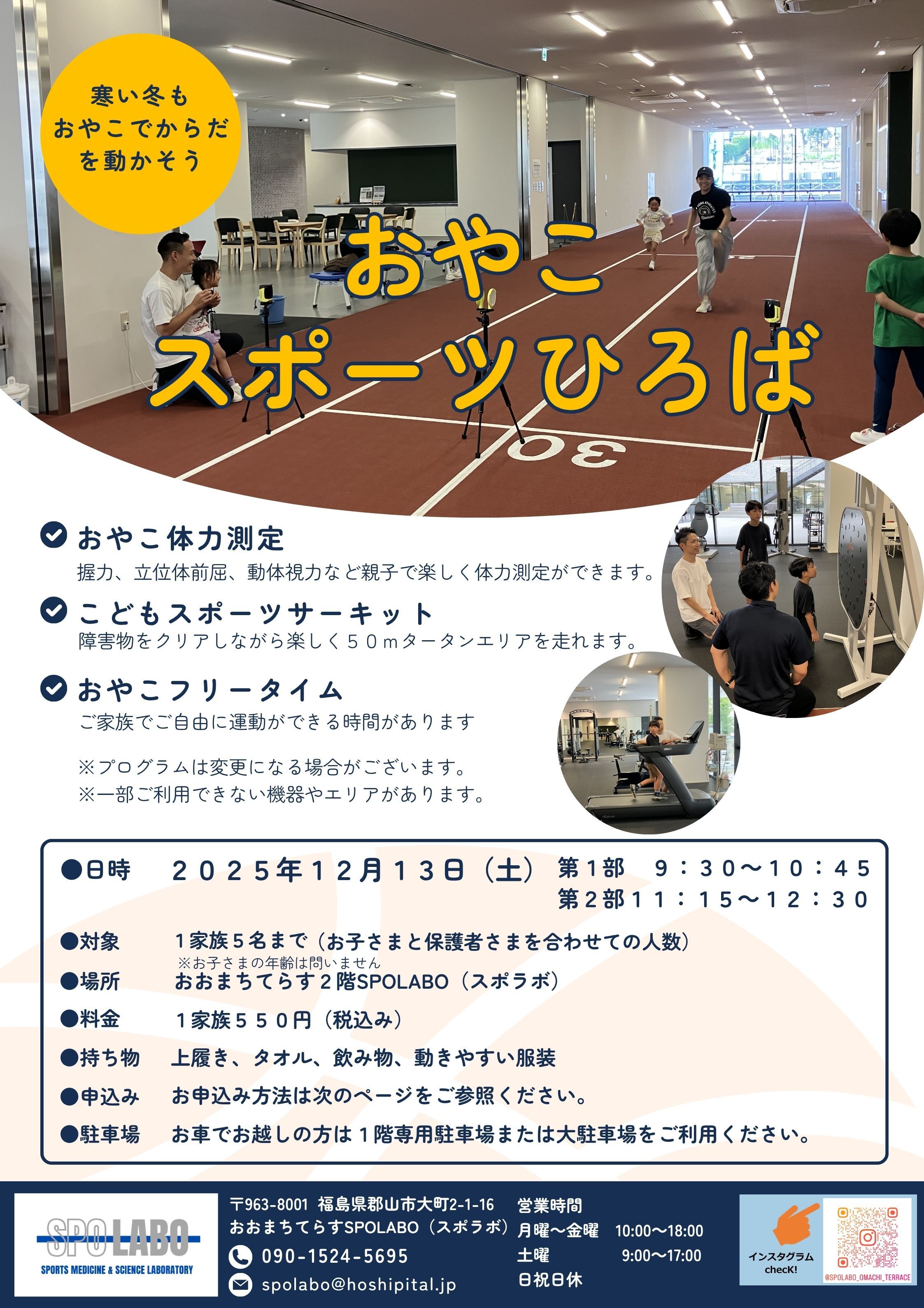 大人気イベントおやこスポーツひろばのお知らせです。あたたかい屋内で、基礎体力測定やおやこで一緒に運動が楽しめるイベントです。おおまちてらすXmasマーケット開催日に同日開催、ぜひ家族そろってご参加ください。